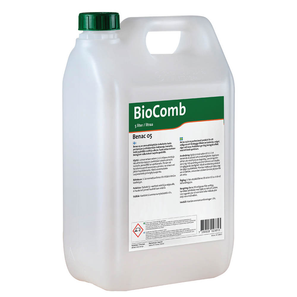 Benac 05 on pinnalla toimiva tuho- ja ehkäisyaine levän, sienen (mm. lahottajasieni) ja jäkälän kasvustoa vastaan. Benac 05 poistaa tehokkaasti ja antaa pitkäaikaisen suojan uutta kasvustoa vastaan, pintamateriaaleja vahingoittamatta. Tuote on käyttövalmis liuos, joka koostuu kvartääri ammonium-yhdisteistä ja vedestä ja toimii erittäin tehokkaasti mikro-organismeja vastaan.